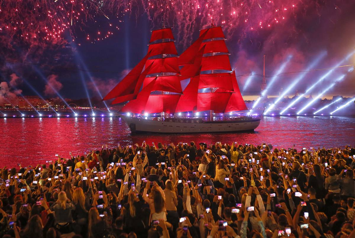 Điểm nhấn nổi tiếng nhất của lễ hội chính là màn xuất hiện của con tàu mang cánh buồm đỏ trên sông Neva. Đây là phần được chờ đợi nhất trong đêm, tạo nên cảm giác như một cảnh phim bước ra đời thực. Khi tàu tiến vào không gian trung tâm thành phố, kết hợp cùng ánh sáng sân khấu, pháo hoa và nền trời mùa Bạch Dạ, toàn bộ khung cảnh mang lại cảm giác rất điện ảnh và khó quên.